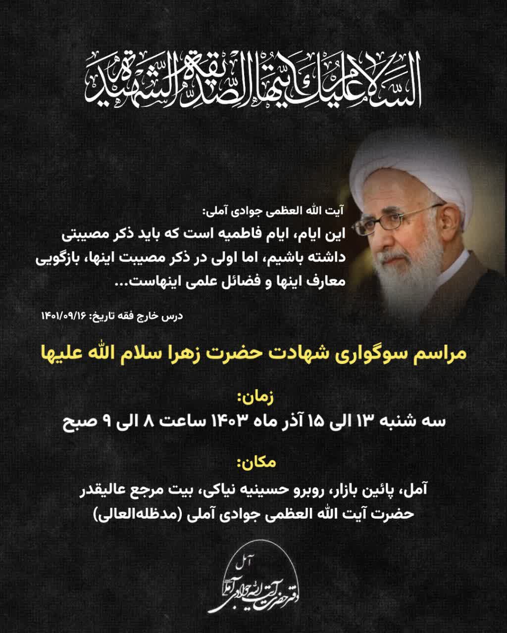 با عرض تسلیت به مناسبت فرا رسیدن ایام شهادت حضرت زهرا سلام الله علیها،به اطلاع میرساند به همین مناسبت مراسم عزاداری در بیت مرجع عالیقدر حضرت آیت الله العظمی جوادی آملی در شهرستان آمل برگزار می گردد