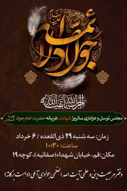 به مناسبت فرا رسیدن سالروز شهادت حضرت امام جواد سلام الله علیه،مجلس توسل و عزاداری در دفتر آیت الله العظمی جوادی آملی در قم برگزار میگردد.