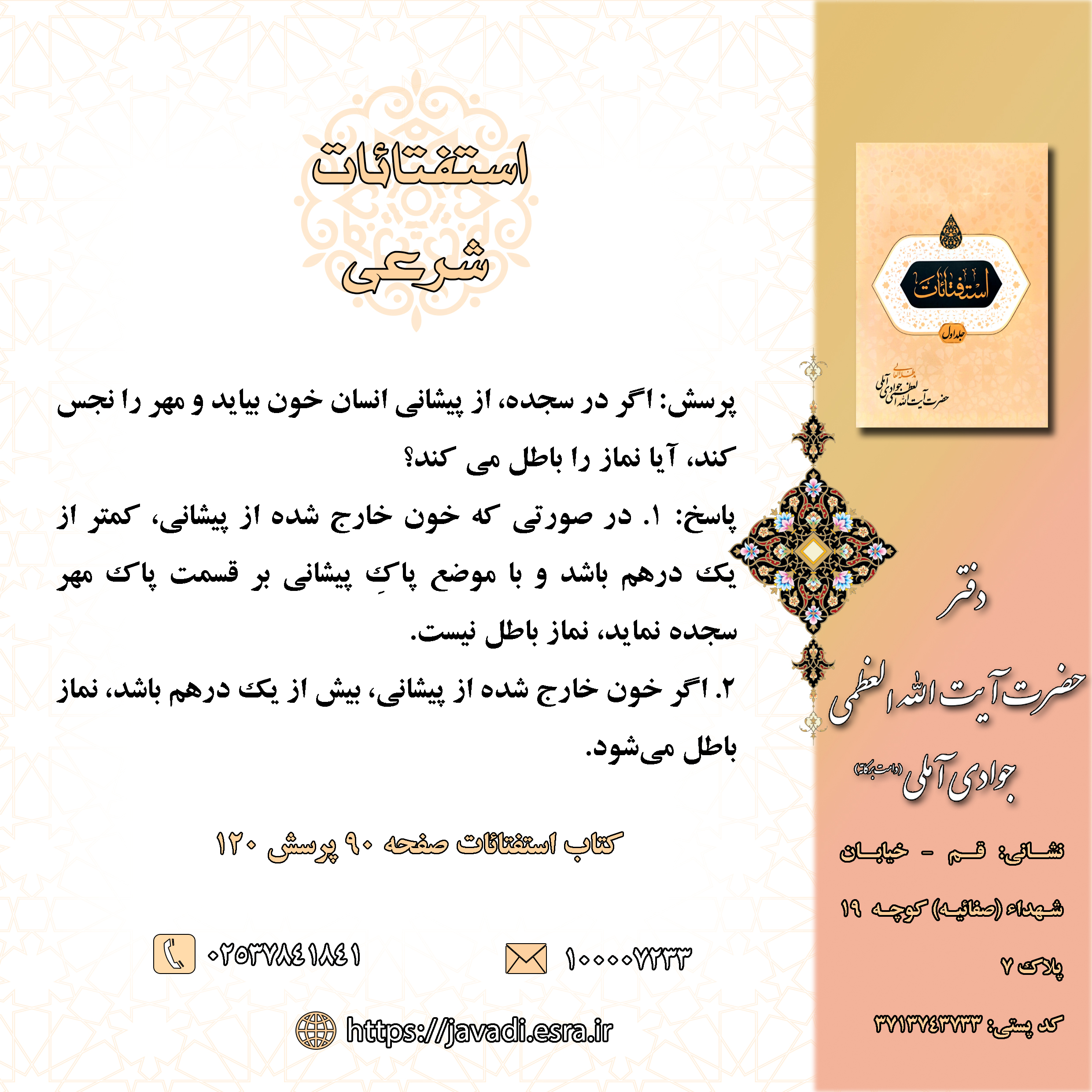 پاسخ: ۱.در صورتی که خون خارج شده از پیشانی، کمتر از یک درهم باشد و با موضع پاک پیشانی بر قسمت پاک مهر سجده نماید نماز باطل نیست. ۲. اگر خون خارج شده از پیشانی بیش از یک درهم باشد، نماز باطل می‌شود.