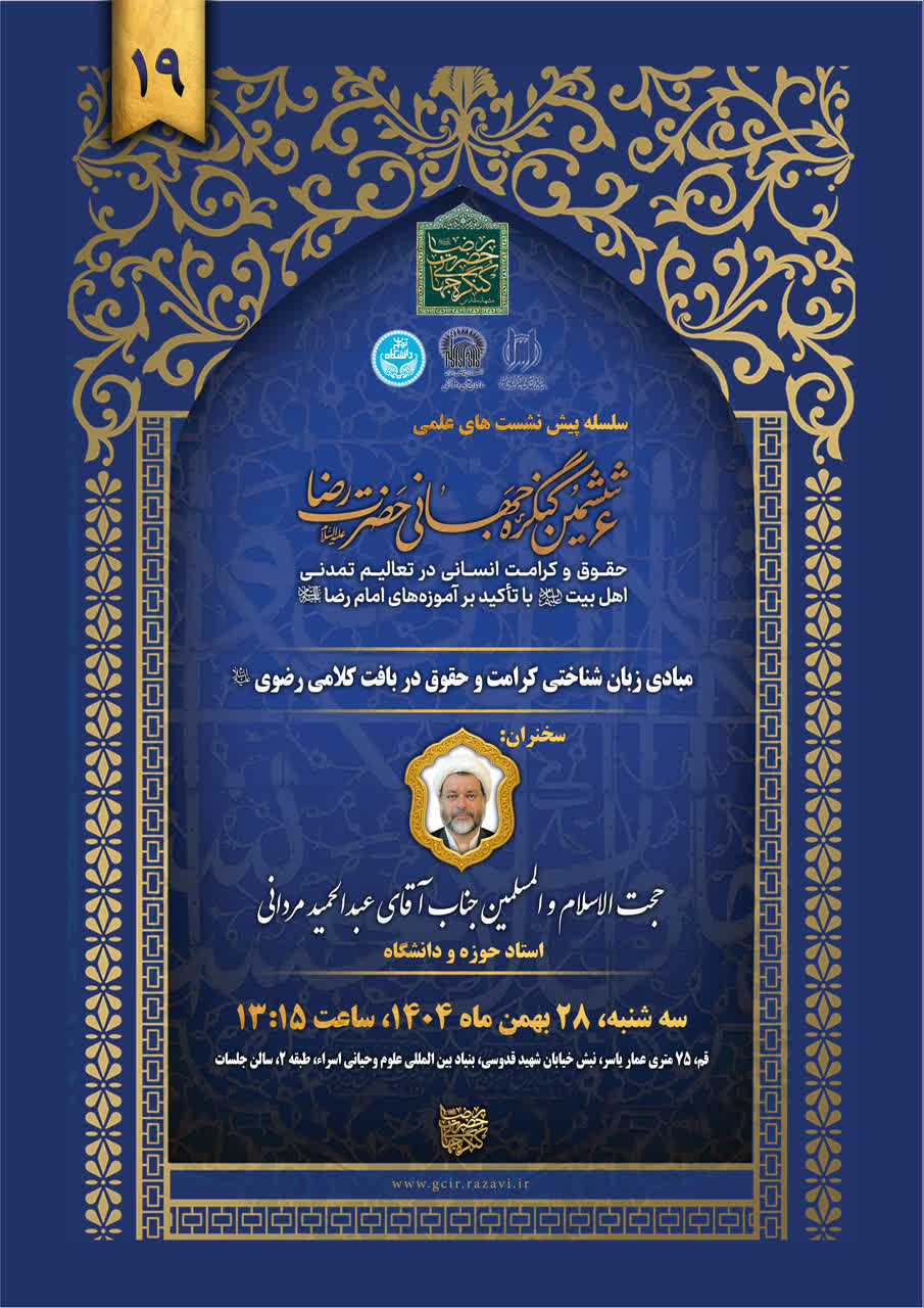 پایگاه اطلاع رسانی اسراء: نوزدهمین پیشنشست از «ششمین کنگره جهانی حضرت رضا علیهالسلام» با عنوان «مبادی زبان شناختی کرامت و حقوق در بافت کلامی رضوی (علیه السلام)» به همت معاونت پژوهش بنیاد بینالمللی علوم وحیانی اسراء و با همکاری دبیرخانه کنگره امام رضا(ع)، در شهر مقدس قم برگزار می شود.
